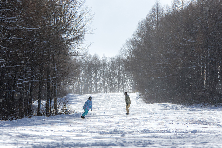 スキーやスノーボード、ウエアなど、滑るのに必要なギアは現地の「白樺レンタル」で全て借りられる。ここではスタンダードなアイテムのほか、パウダー用アイテムを借りられる「テストセンター」もある。非圧雪エリアやツリーランコースが充実する斑尾高原は、パウダーボードやファットスキーの試し乗りにもってこい。抜群の浮力や操作性を実感できることだろう。