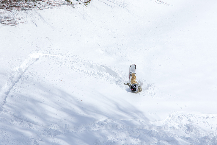 迂回コースを抜けると開放的なクリスタルコースが広がっていた。このあたりはコース脇にパウダーが残っていることがあるので、彼女もパウダーライディングにチャレンジ!コケて雪まみれになったって二人なら楽しい(笑)