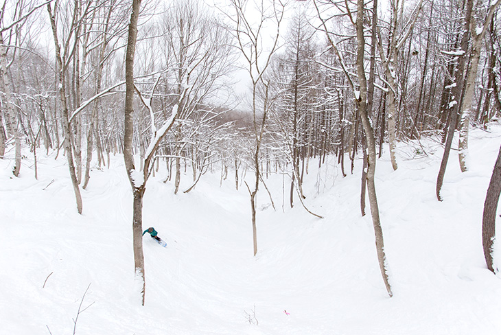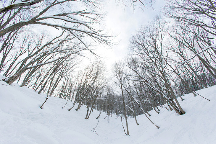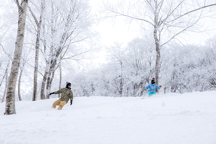 斑尾高原の醍醐味は何と言っても、国内最大級のツリーランコースで味わうダイナミックな滑り。レベルに応じた多数のツリーランコースがあるので、ツリーラン入門者から上級者まで幅広いパウダーフリーク達を楽しませてくれる。