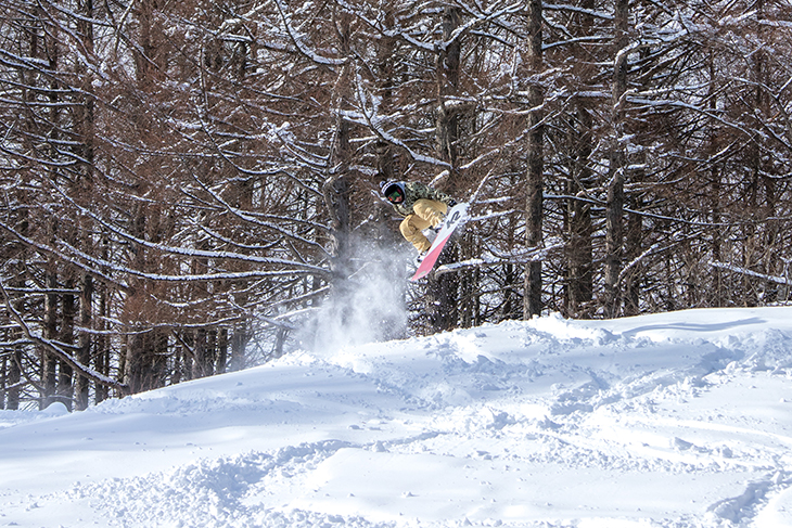 斑尾高原の魅力は豊富な積雪量と、ツリーランコースが日本最大級なこと。コース内の多くに天然雪の非圧雪エリアを設定するほか、森を開放して自然そのままの地形を楽しむことができる。丸太アイテムを設置した「NINJA」コースは、トリックを決めつつ、たっぷり積もった雪にダイブできる人気のポイントだ。ほかにも、沢地形を利用した天然ハーフパイプを楽しめる「SAWA」など、自然と一体になった滑りを体験できる。