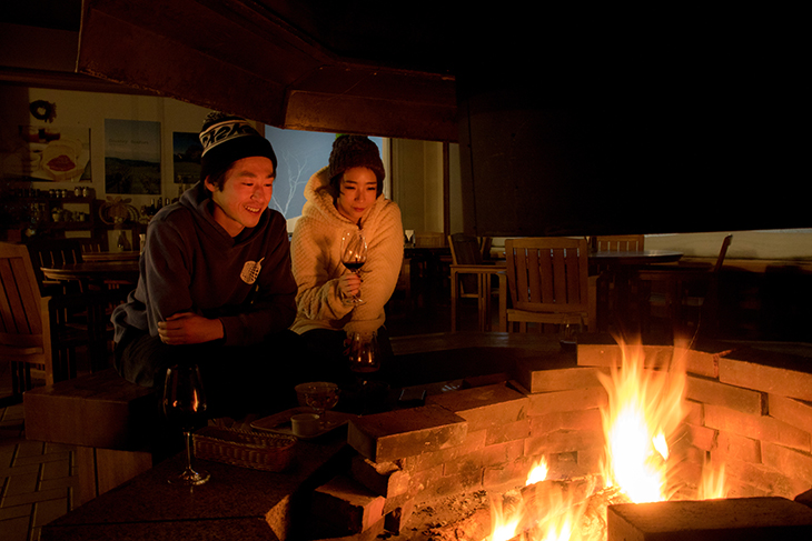 レストラン横のラウンジには何とも良い雰囲気の暖炉がある。柔らかな火を眺めながらいろいろ話しているとあっという間に時間がたってしまう。ロマンチックな演出をするならココはマストだ!