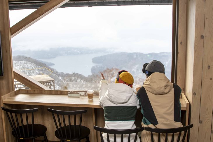 タングラム名物の野尻湖テラスでは、香り高いコーヒーと共に絶景を楽しむことができ、疲れた身体を癒してくれるので、斑尾山を欲張り過ぎて疲れたら、ここでちょっと一息ついてみてはどうだろう。もちろん、景色だけを堪能したい、スキーをしない人でも利用可能。※ チケットセンターで、野尻湖テラス観光リフト乗車券をお求めください。