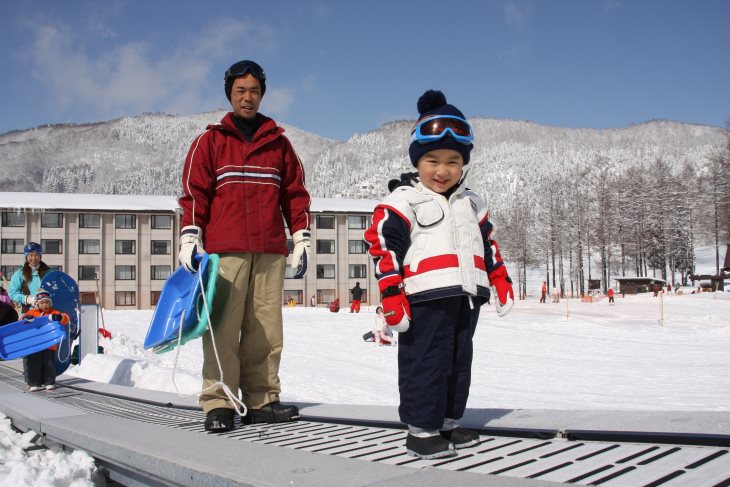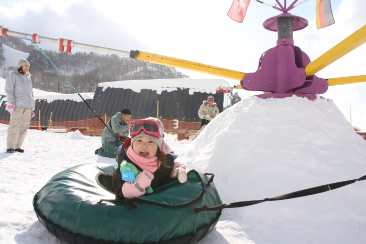 ファミリーに人気のキッズパークには、スノーエスカレーターが設置され、お子様はらくらく上まで登って遊べるので、お父さん・お母さんの救世主。また、雪上のメリーゴーランドと言われるボーラーカルーセルや、たくさんの雪上遊具があるので、お子様が一日遊んでも飽きさせない魅力的なキッズパークになっている。