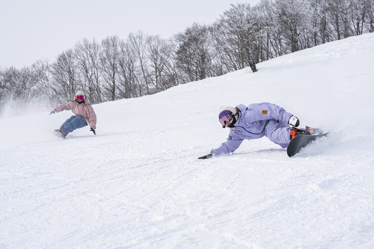 斑尾高原は程よい斜度とコース幅のあるキレイな圧雪バーンが自慢のひとつ。メインバーンの「ジャイアント」や斜度変化を楽しめる「チャンピオンコース」では、カービングのキレにも磨きがかかる。柔らかくて滑りやすい最高の雪質に、3人のビッテリーターンやリバースターンも絶好調! 朝イチのビタビタに整備された柔らかなコーデュロイバーンはパウダーに負けず劣らず人気で、多くのスキーヤー&スノーボーダーを魅了する。