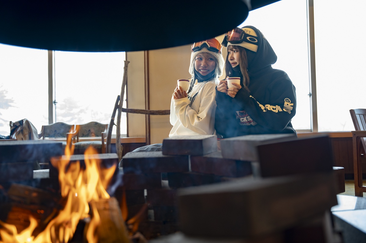 2Fには大きな暖炉に暖かな火が灯り、ゲレンデを眺めながら優雅な空間でカフェメニューをゆったり味わえる。ウエアのままでも暖まりながら休憩できるホテルのラウンジで過ごす時間は贅沢そのものだ。