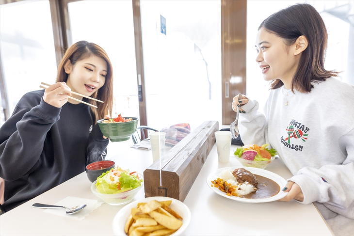 ランチはゲレンデ中腹の「とんふぁん」も広くて席数が多く、ボリュームたっぷりのメニューも用意してあって人気だ。こちらも「プラトー」同様にテーブルにはアクリル板の衝立を設置し、席の間隔も余裕がある。