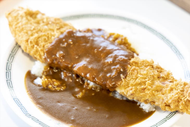 「びっくりひれかつカレー」という名前の通り、皿からはみ出しているほど巨大な「ひれかつ」は見た目のインパクトだけでなく、衣がサクサク、お肉もジューシーなのでおすすめ。