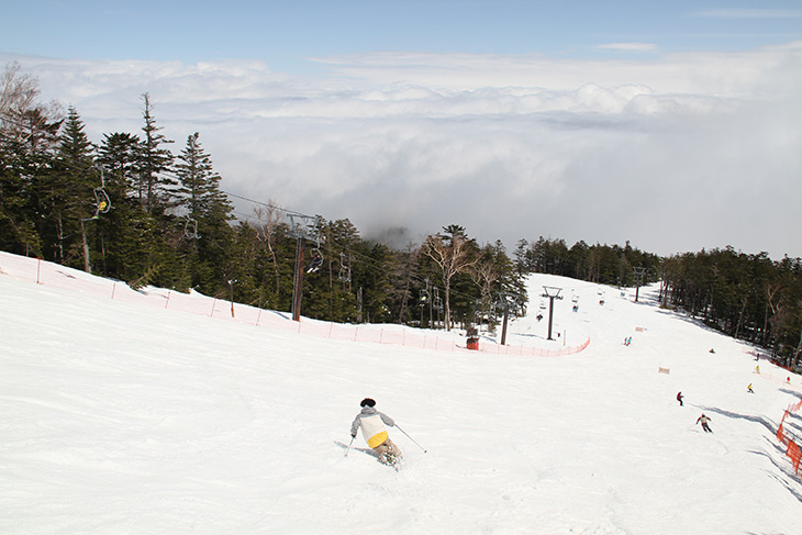 ゲレンデ上部は中~上級斜面が伸び、中腹から山麓にかけて斜度がやさしくなり、どのコースを通ってもセンターハウスに滑り降りるシンプルなレイアウト。展望が良く、正面に中央アルプスが広がっていたかと思うと、カーブを曲がると今度は乗鞍岳を眺めながら滑るなど、景色がどんどん変化。振り返れば御嶽山が間近に迫り、どこからの景色も美しい。