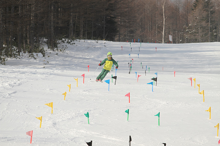 緩やかな斜面にショートポールを設置した「マジックスラローム」は、滑るうちにスキルアップする不思議なアトラクションコース。ショートポールはカラフルに色分けされており、赤だけ通る、黄色と青を交互になど、自分で好きなコースを設定できる。目標物を設定することで、どのラインを通ってどこで曲がるといった板の操作を意識するようになり、普通のコースを滑るよりも技術がグッとアップするというわけだ。