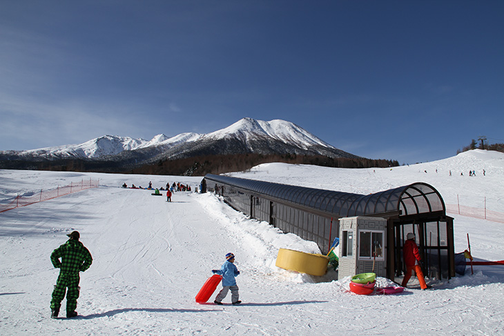 「キッズパーク」には、マイアスキーアカデミー専用のレッスンバーンと、一般の方がスキーやスノーボードを練習するスペースもあり、安心安全に過ごすことができる。斜面を登るスノーエスカレーターは屋根がついた「らくらくトンネル」。雪が降っても風が吹いてもこの中なら快適なうえ、トンネルをくぐり抜けるだけでも子どもたちにとってワクワクとする体験だ。