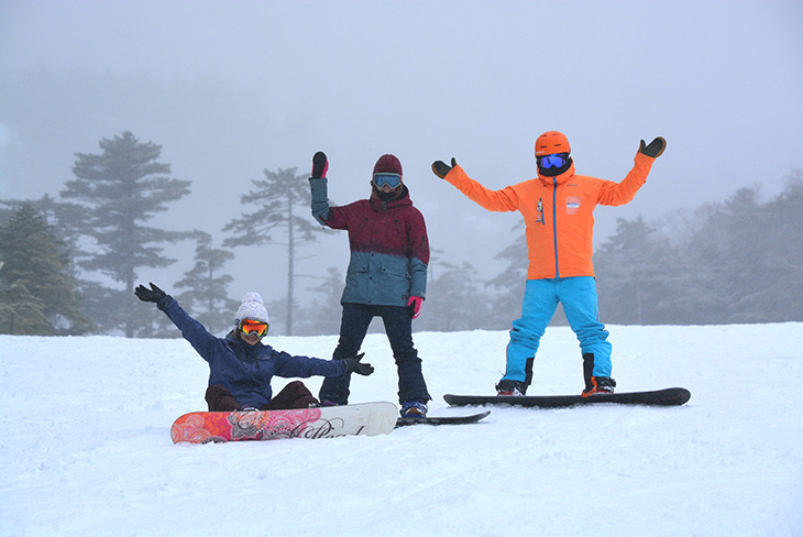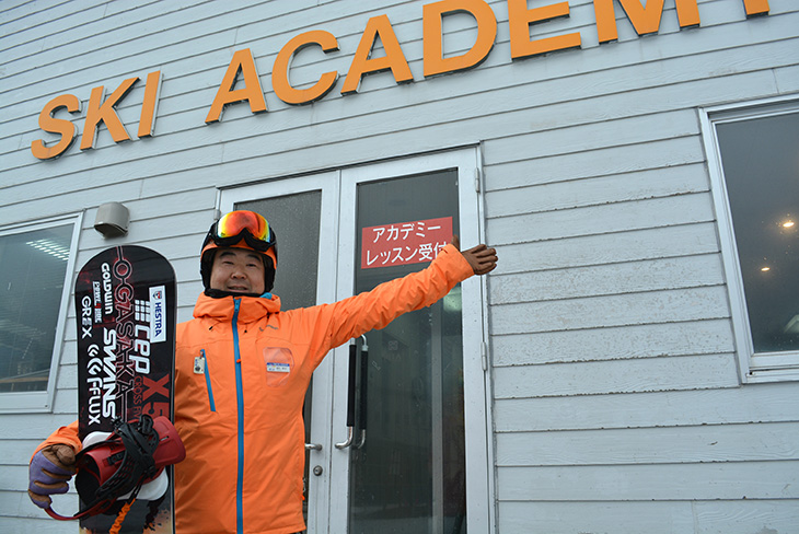 アカデミーに所属するSIAのスノーボードデモ・藤井耕司さんは、デモ認定10回というベテラン。朗らかな人柄と確かな技術と知識に定評があり、藤井さん目的にレッスンを受けにくるリピーターも多い。