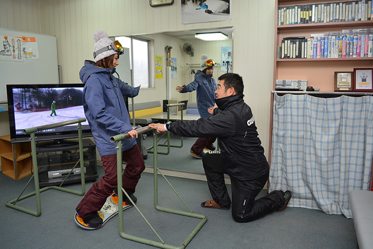 その特徴のひとつが、雪上レッスンのほか、屋内で器具を使いながらフォームの確認までするきめ細かなケア。滑りのクセや姿勢の修正、体の使い方を見直す良い機会になり、滑りの基本、知識、実践をトータルで学ぶことができる。