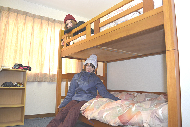 仲間とゆっくり過ごせる過ごせるスキーヤーズベッドを備えた部屋。1泊2食+リフト券付きのお得な宿泊パックを用意している。家族や友人とマイアを訪れるなら、ぜひ利用してみよう。