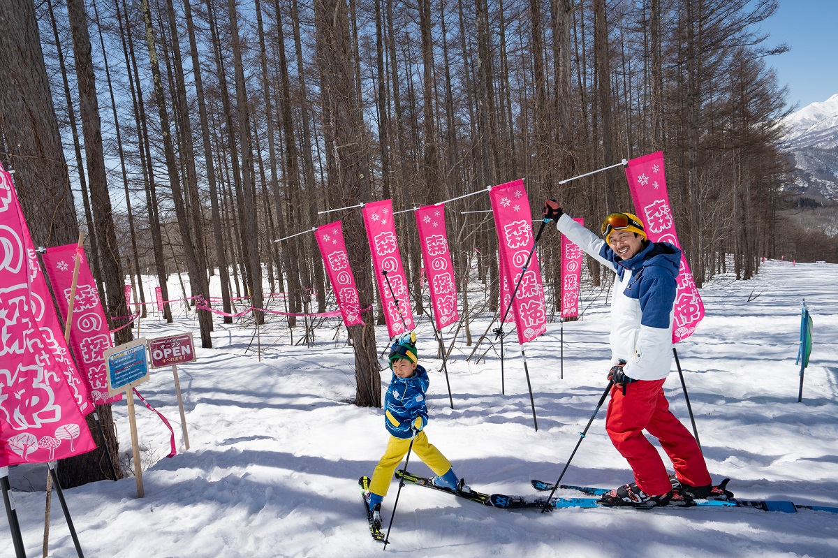 さらに滑ることに慣れてきたら、「森の探検~カラマツ~」へ。自然の地形を活かしたカラマツ林を抜け、かっこよく滑ることにチャレンジしよう!