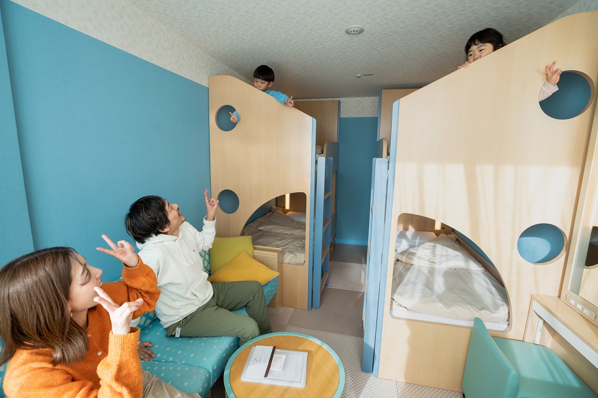 客室は様々なタイプから選べ、家族で楽しく過ごせる工夫もいっぱいだ。家族でのつどいをコンセプトにした「フォレストキャビン」は、コンパクトな空間を最大限に利用した2段ベッドタイプのお部屋。子どもにとっては夢のような部屋で、ワクワクが止まらないだろう。