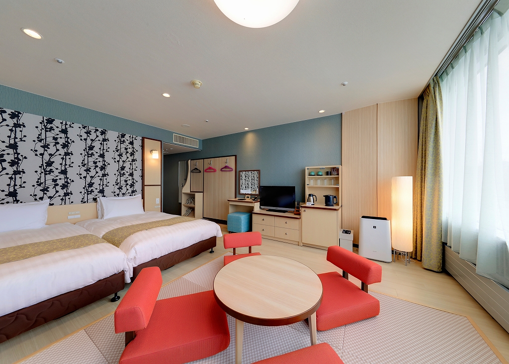 和洋室のファミリーツインは子ども連れに一番人気。4人家族ならツインルームを2部屋とるというのも、それぞれがゆったりとした空間と時間を過ごせてオススメ。部屋の窓はまるで景色を切り取ったような眺めで、水上高原の自然を部屋にいながらも存分に感じることができる。