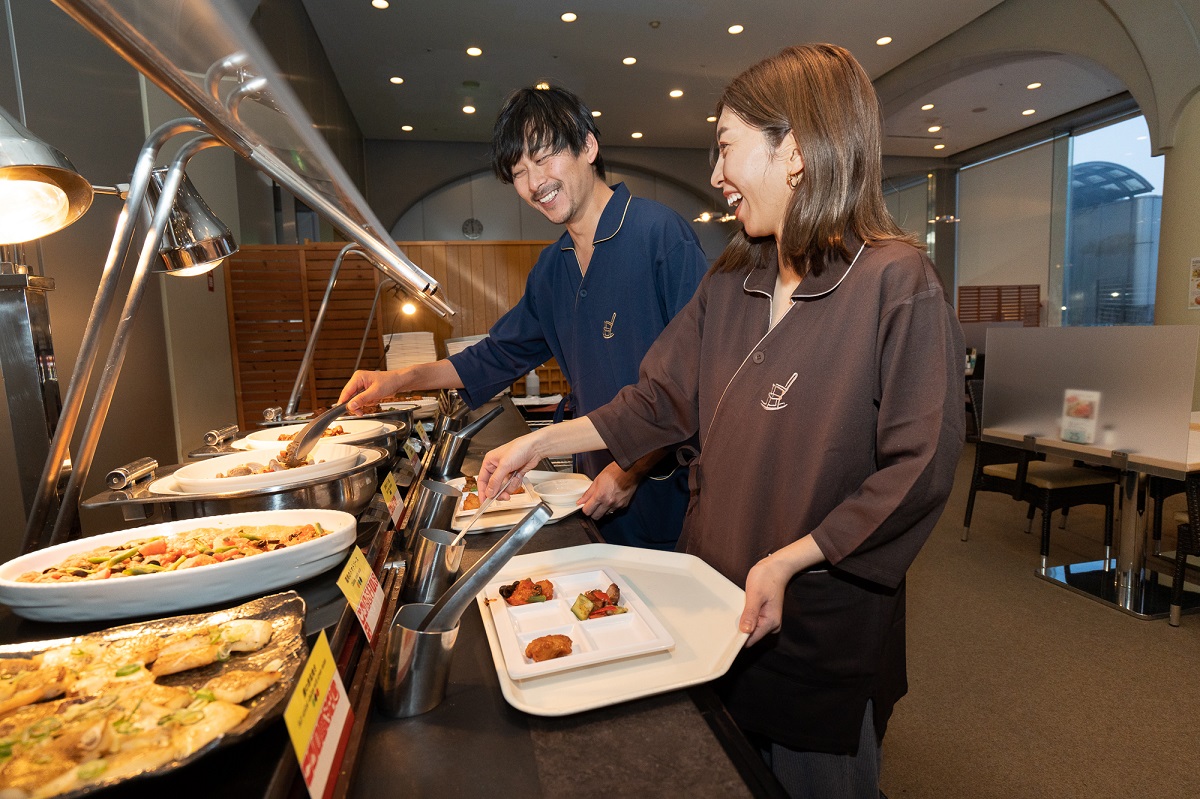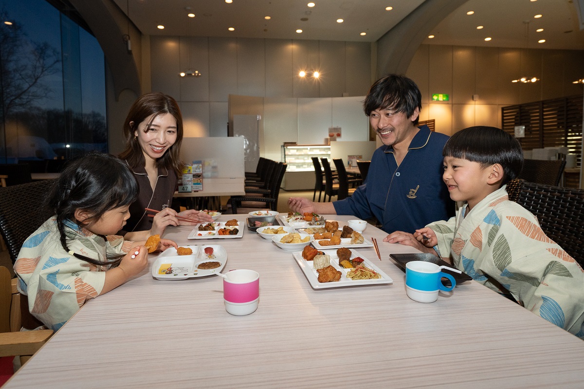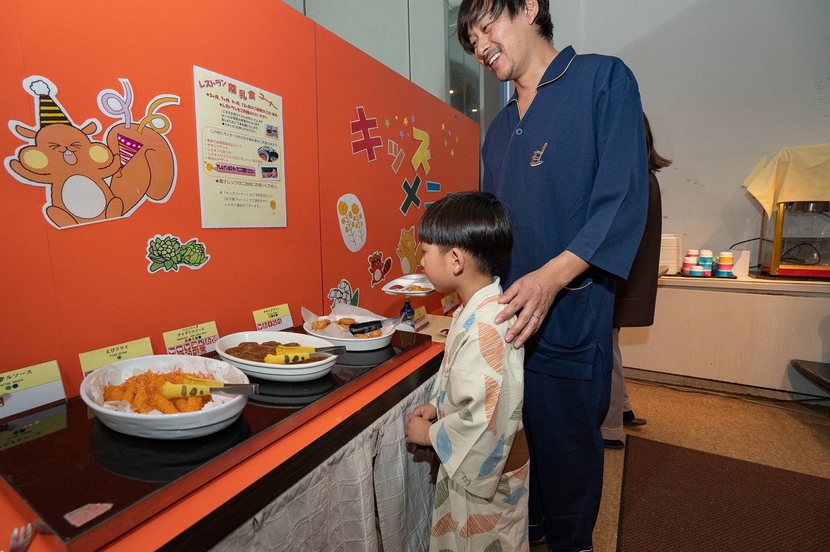 夕食はシェフが厳選した旬の食材を使った料理がズラリと並ぶバイキング。ライブキッチンで提供されるホテル自慢の「ローストビーフ」は、仕込みからこだわりじっくり焼き上げられた子どもにも大人気の絶品メニュー。メニューはすべて36品目のアレルギー表示があるので安心して食べられ、キッズメニュー、パティシエオリジナルデザートも充実している。