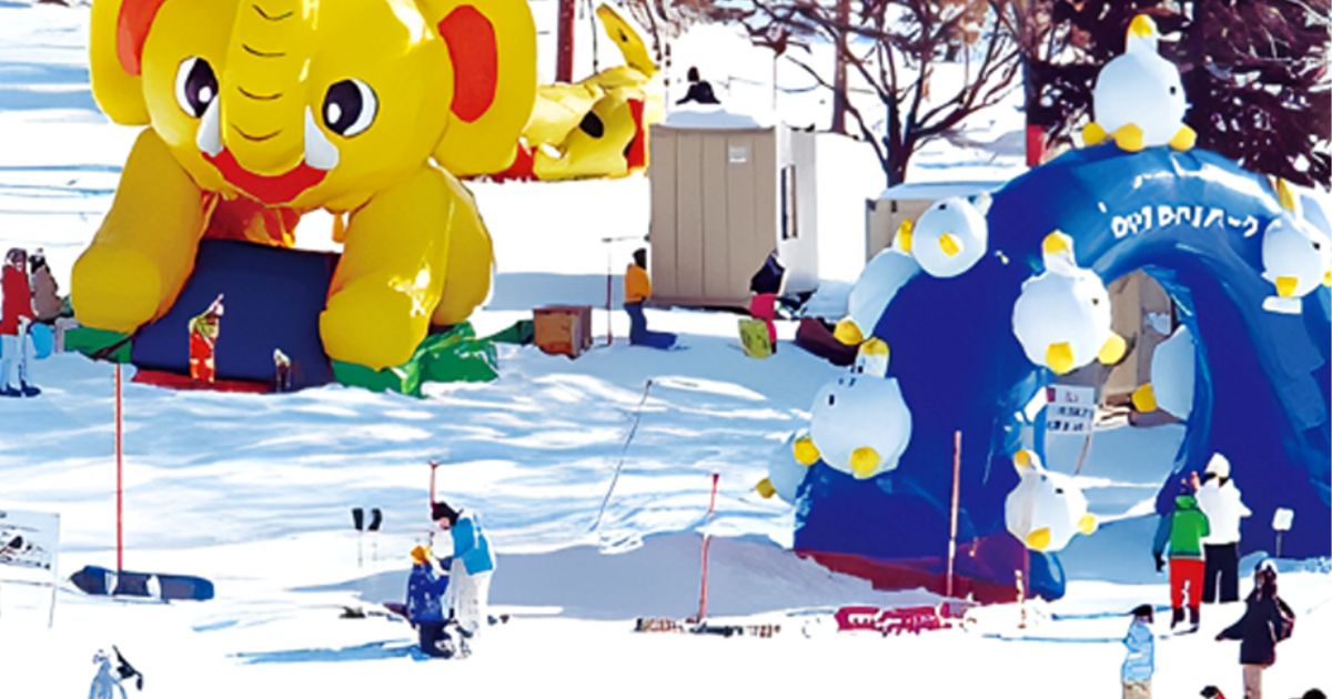 たかつえスキー場のキッズパーク「ワイワイパーク」は、専用の動く歩道を備えた充実した施設です。スノーストライダーやタイヤチューブなど種類豊富なソリが揃い、滑り台付きのふわふわぞうさんは子どもたちに大人気。専用の休憩所もあり、家族みんなで快適に雪遊びを楽しめます。