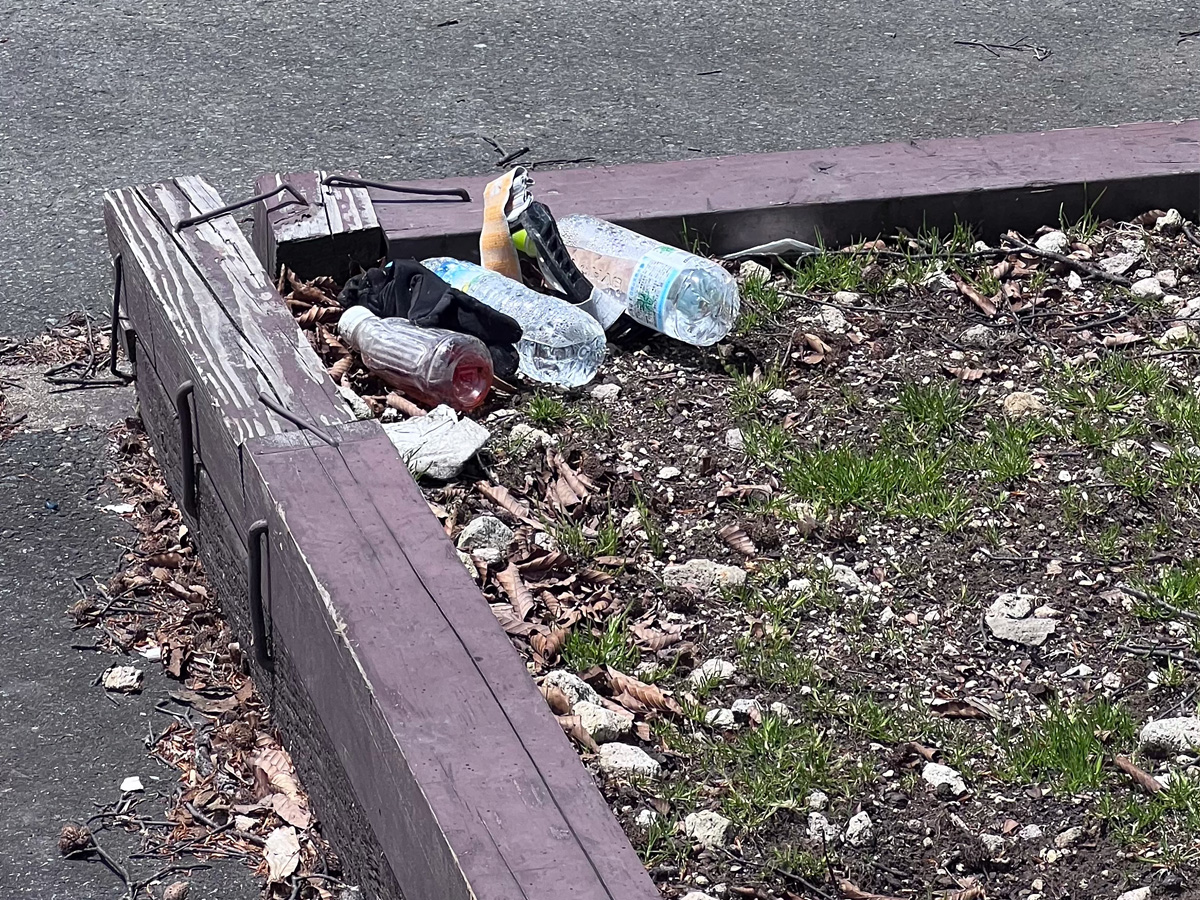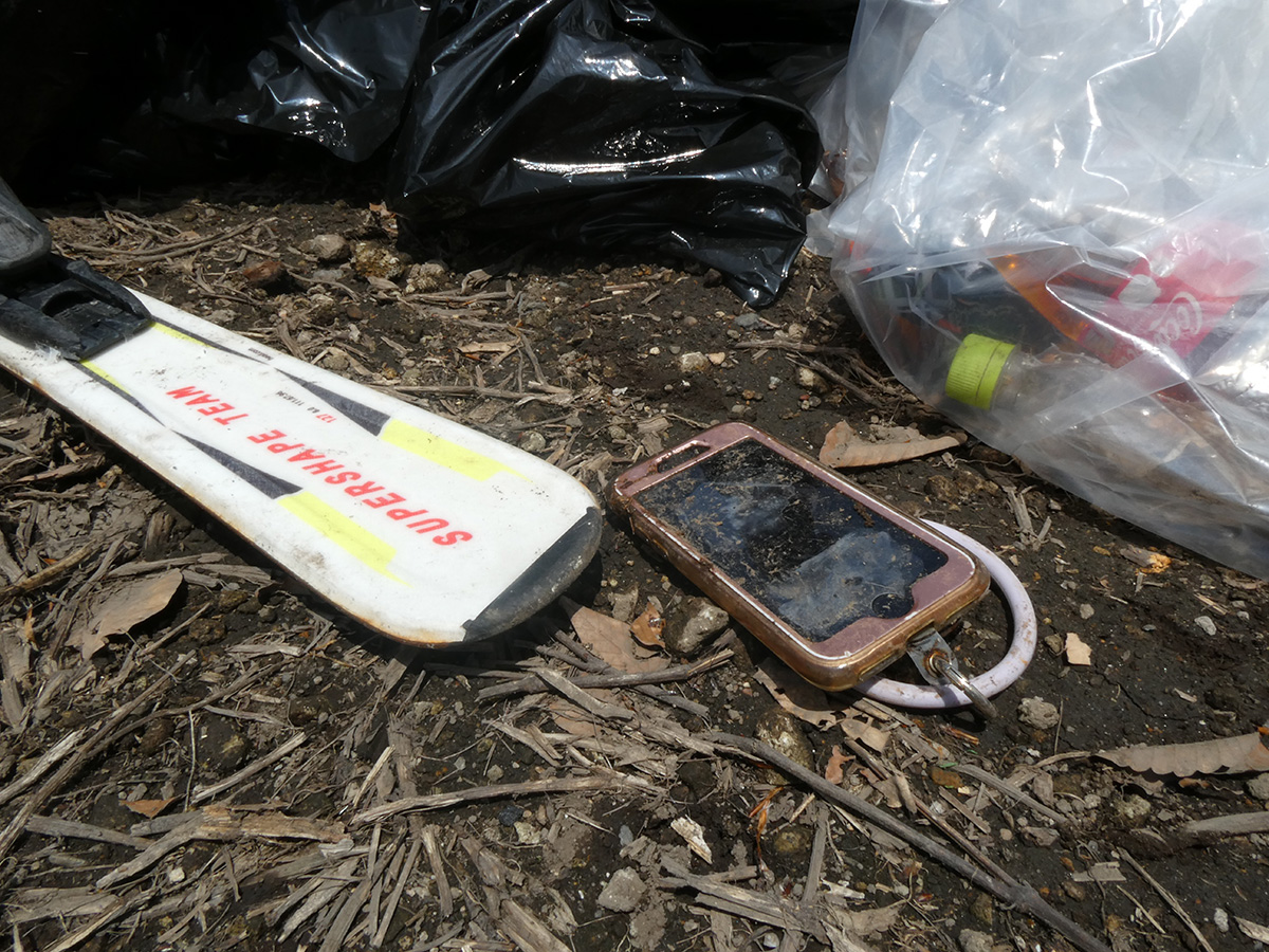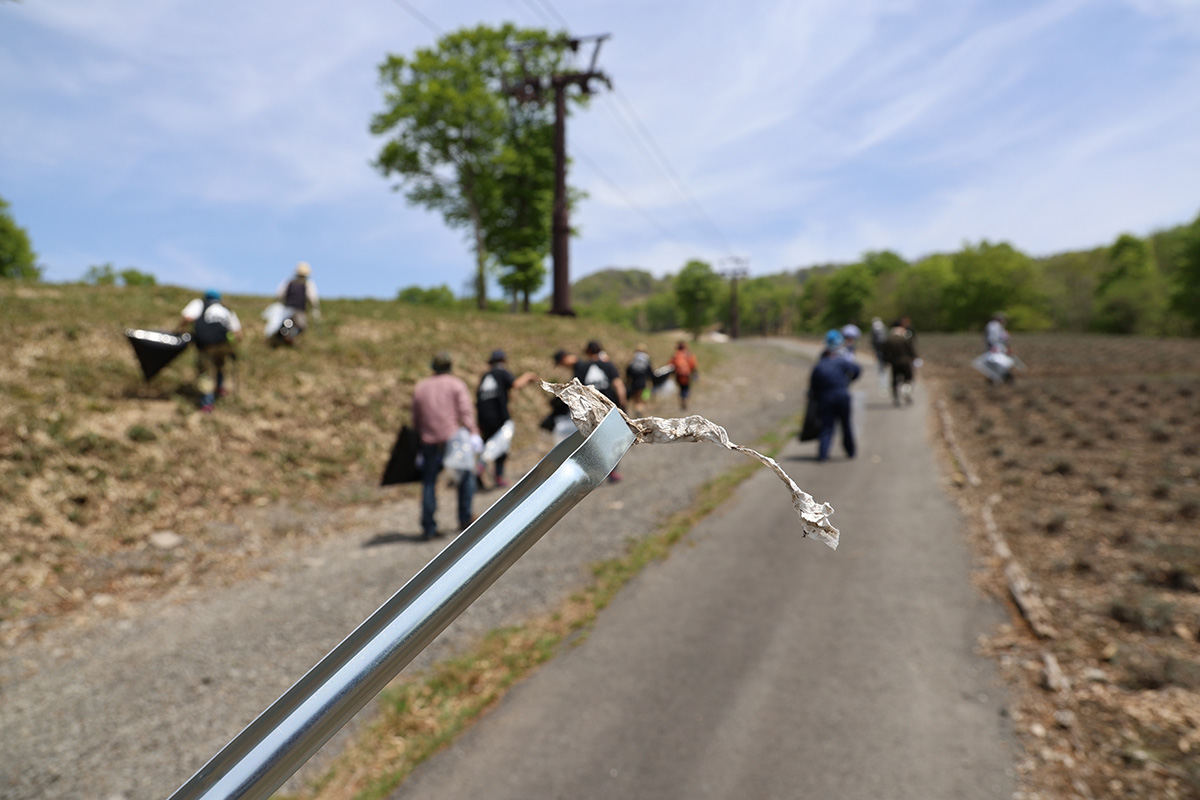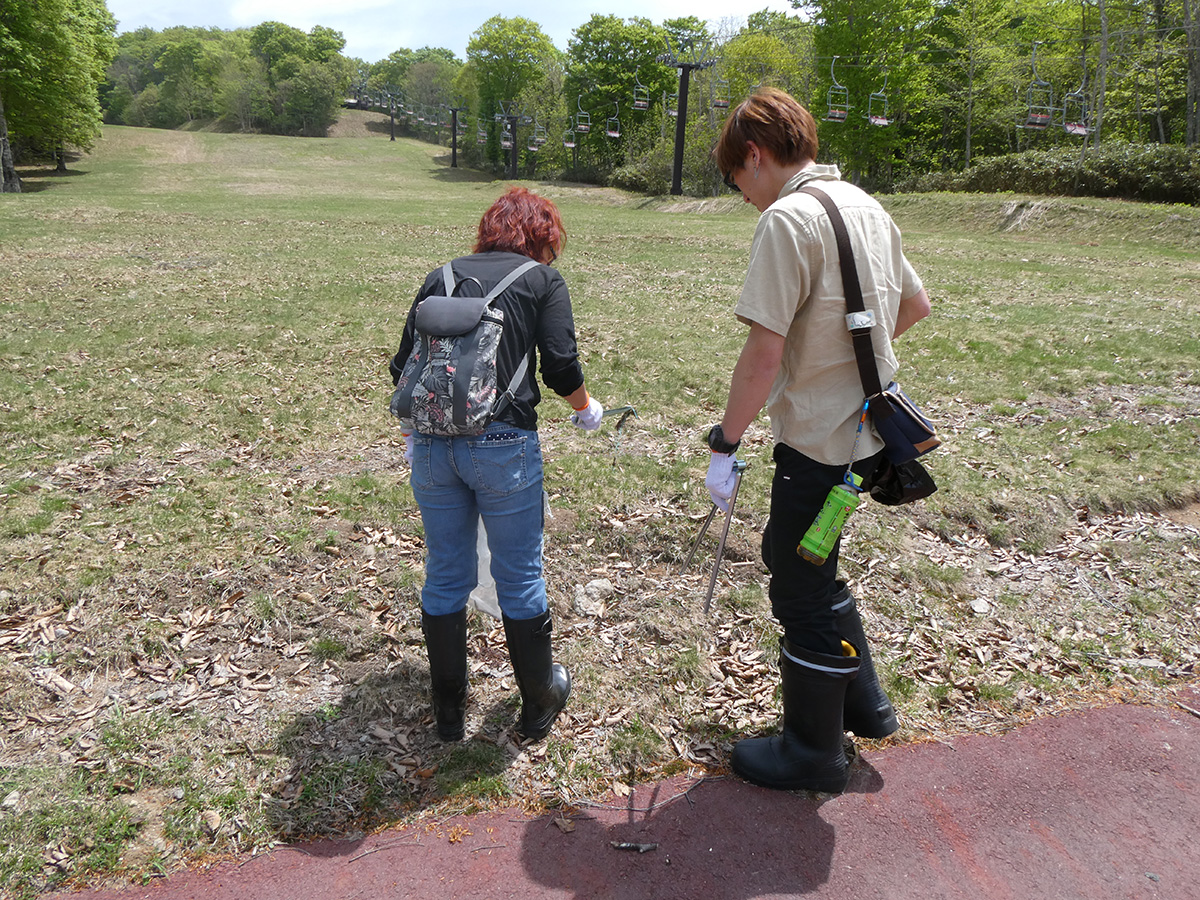 雪がなくなったスキー場には、冬の間に意図せずとも落とされてしまった飲料の容器やお菓子などのゴミ、スキー用品など様々なものが落ちている。