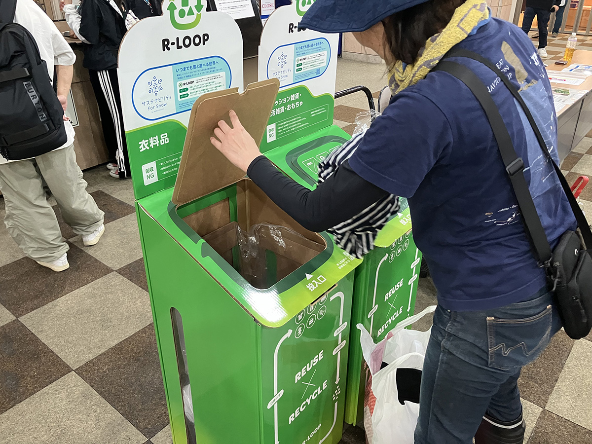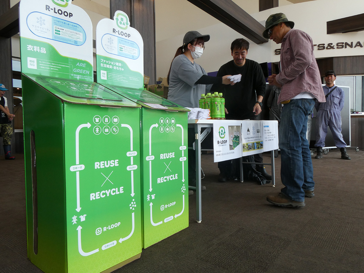 受付では、今シーズンスキー場エントランスに設置していた「R-LOOP」の回収ボックスで不用品の回収も実施。この取り組みは、過酷な環境下で使用されるスキー用品の買い替えと廃棄の頻度に課題を感じている東急スノーリゾートが、環境 への取り組み「サステナビリティ for Snow」の一環として行なっているもので、シーズン中、4カ所のスキー場に回収ボッ クスを設置し、不要となった衣類や雑貨を回収している。