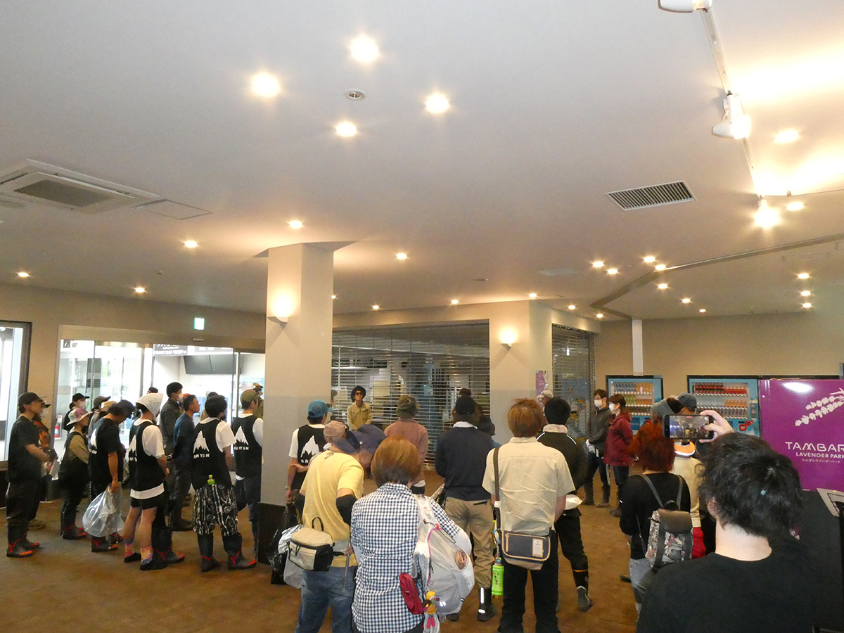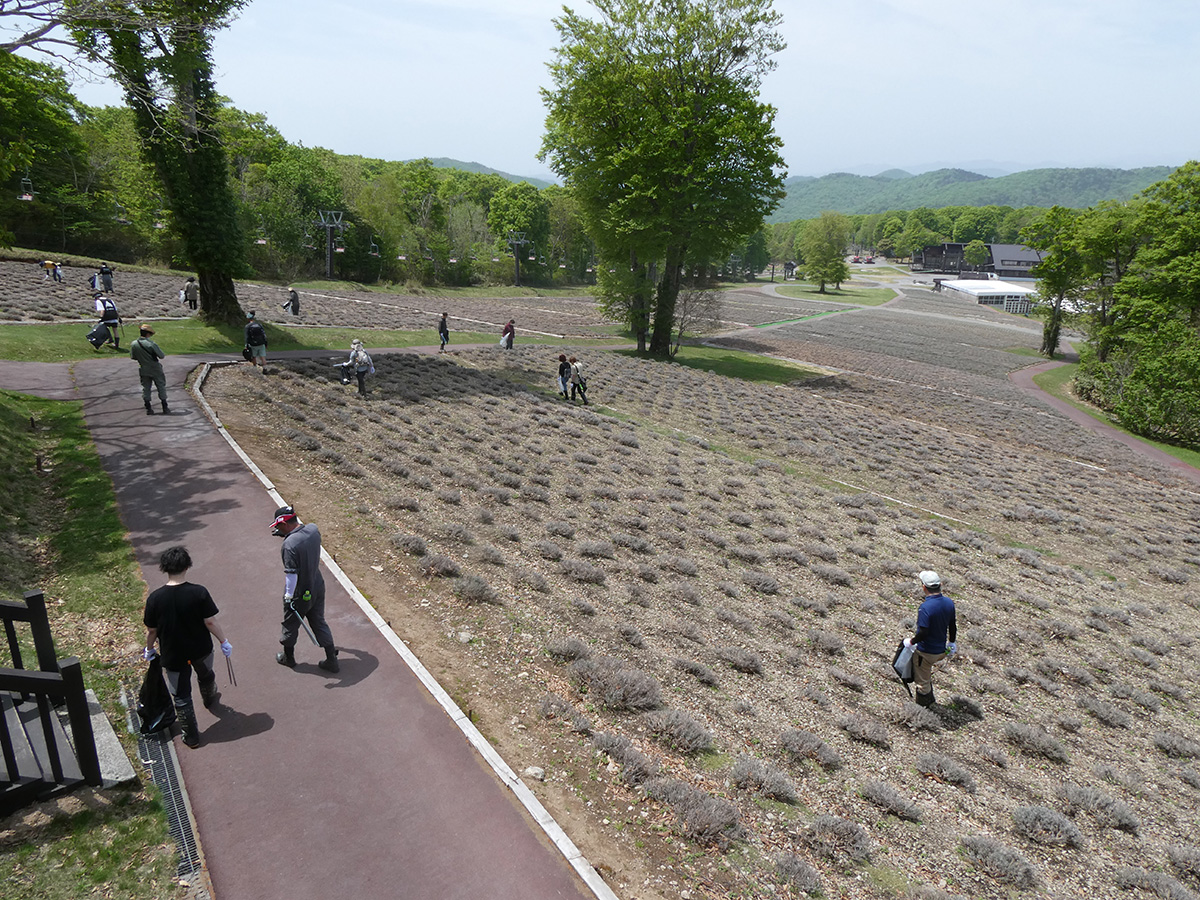 グリーンシーズンにはラベンダーパークとして営業しているたんばらスキーパークは、雪が消えると綺麗に畝が整備されたラベンダー畑が姿を現す。つい数週間前までここで滑っていたのかと思うと、不思議な気分だ。2グループに分かれてクリーンナップがスタート!