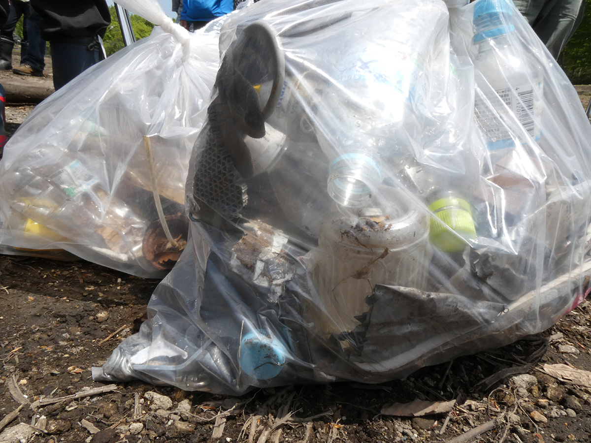 気づくとあっという間に1時間半がたち、山麓に戻る頃にはそれぞれのゴミ袋には小さなものから大きなものまで、たくさんのゴミが集まっている。全員が戻ったところで集めたゴミと記念写真。