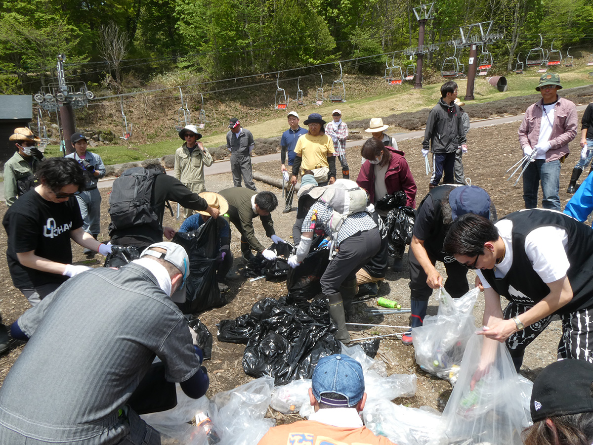 意識しなければ見落としてしまいそうな小さなゴミも、集めるとものすごい量になる。冬の間存分に楽しませてもらった施設において、コースやスキーセンター周辺を歩きながらゴミ拾いをするこの活動を通して、山や自然の環境を守る意識を高めるとともに、スキー場勤務やメーカー、ショップスタッフなど、互いに違う立場の者同士が共同作業することはとても大きな意味を持つ。