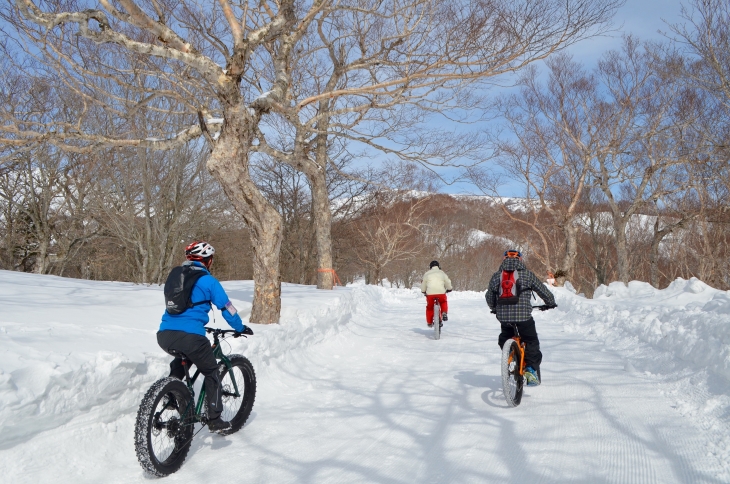 おすすめは、「ファットバイクツアー」。ファットバイクは、雪道でもガシガシ走れる、太いタイヤを装着したマウンテンバイク。ゴンドラ山頂の脇に設けられた、雪原の特別エリアを、レクチャーを受けながら、自由にサイクリングできる。