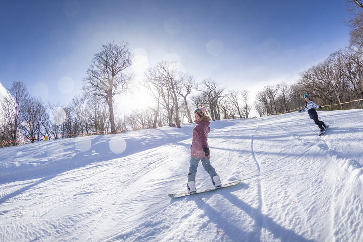 山頂からは中級レベル以上でであれば気軽に滑走OK。サンアップの雪質の良さ、コースの楽しさ、木々の美しさも感動モノ。