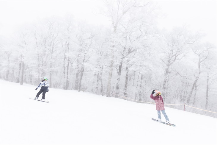 晴天率の高さも魅力のマウントジーンズ那須だが雪が降れば、これまた幻想的な雰囲気の中で滑走を楽しむことができる。天候が多少悪くても、とりあえず山頂へ向かうべし!