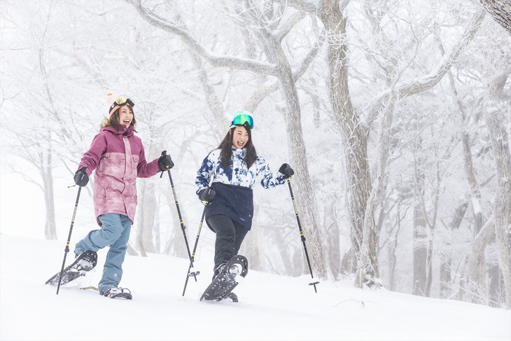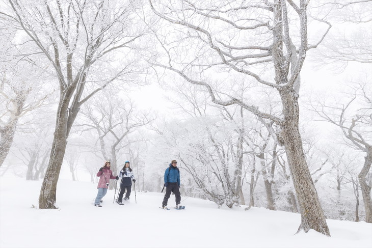 スノーシューツアーは山頂で気軽に楽しめる人気アクティビティのひとつ。美しいブナ林の中をガイドと一緒に楽しく、ゆっくりお散歩。