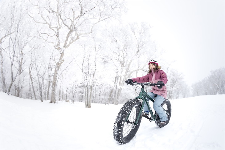 もうひとつチャレンジしてみてほしいのが、山頂の雪原を専用の自転車でサイクリングする「ファットバイクツアー」だ。雪の上で自転車に乗るのが難しいのではと思うかもしれないが、思ってた以上に簡単で楽しい(笑)。