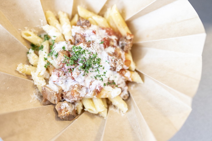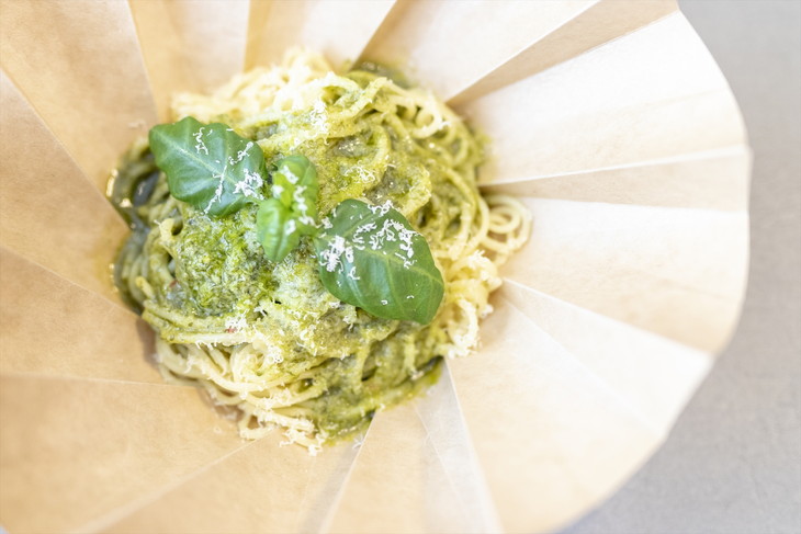 ユニークなのはパスタが入っている容器。できあがって渡された時はカップ型なので、立ったまま食べることもできるし、帰りのバスやクルマの中で食べることもできる。