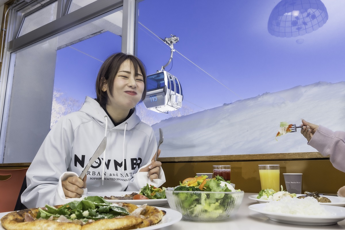 かぐらゴンドラ山頂駅1Fにある「レストラン かぐら」では、ピザ・パスタ・カレーなどが人気。丸一日しっかり滑り倒すためには、エネルギーチャージは欠かせない!