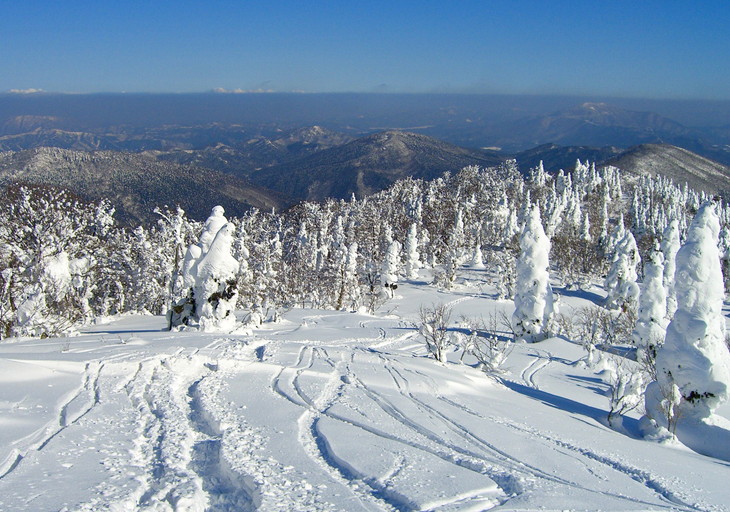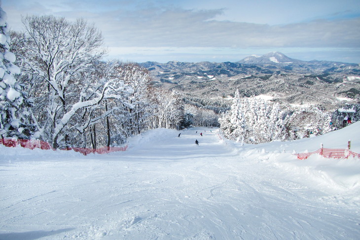 恐羅漢山山頂付近はブナ、ケヤキ、ミズナラの巨木が群生し、大自然の美しさを実感。ゲレンデの最高地点は山頂にほど近い「ブナ坂第3ペアリフト」降り場。山頂からは晴れた日には日本海まで見渡せる素晴らし眺望を楽しむことができるイチ押しのスポットだ。