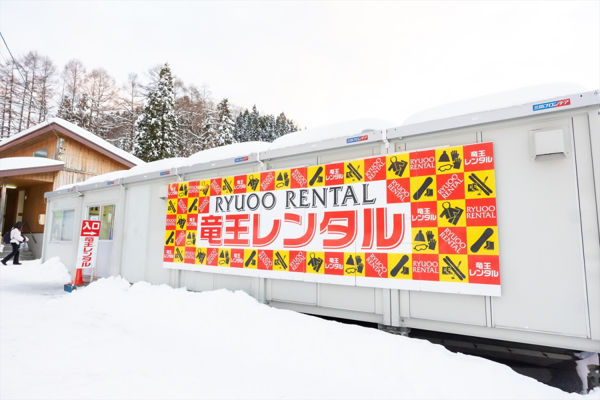 レンタルはインフォメーションセンター横にある「竜王レンタル」へ。オリオンツアーの基本料金にはスノボやスキーだけでなくウエアのレンタルまでも料金が含まれる(物損免責保証料だけ別途必要)。