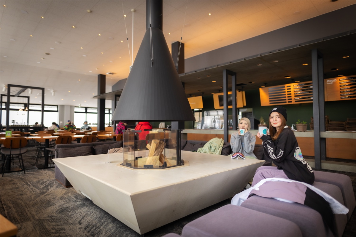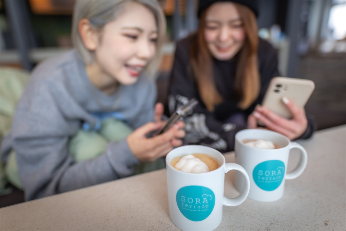 山頂での休憩は「SORA terrace cafe」へ。素晴らしい絶景、滑る楽しさに夢中になってしまいがちだが、スカイランドエリアは標高が高いので、その分空気が薄く、気温も低めなので、落ち着いた開放感のある空間で、しっかり身体を休めることも大切。