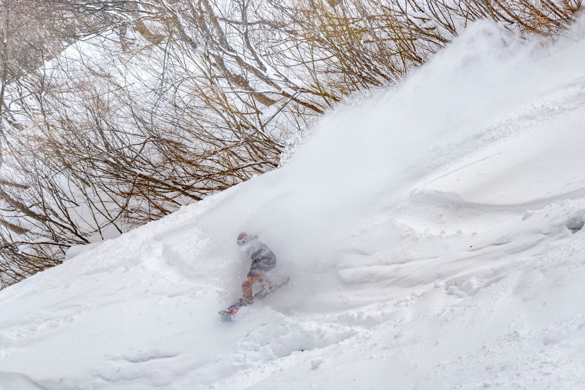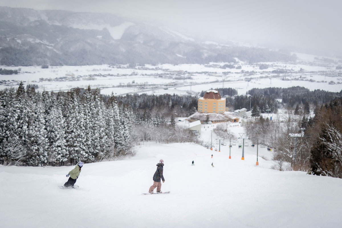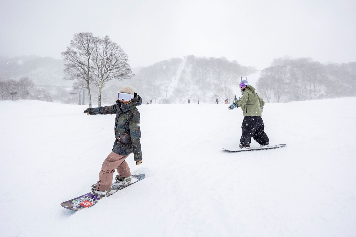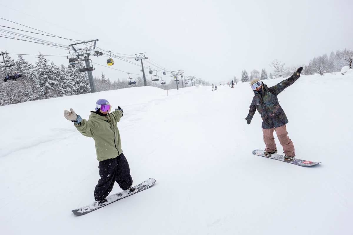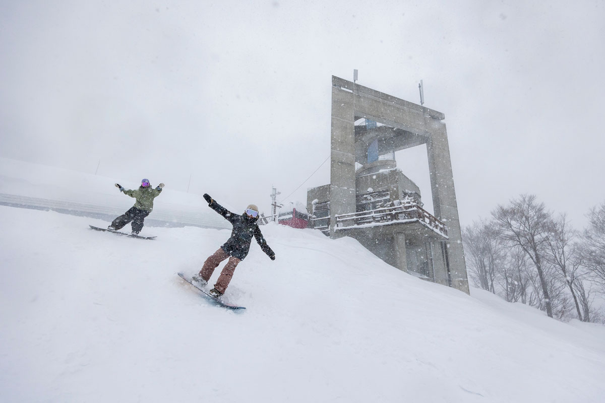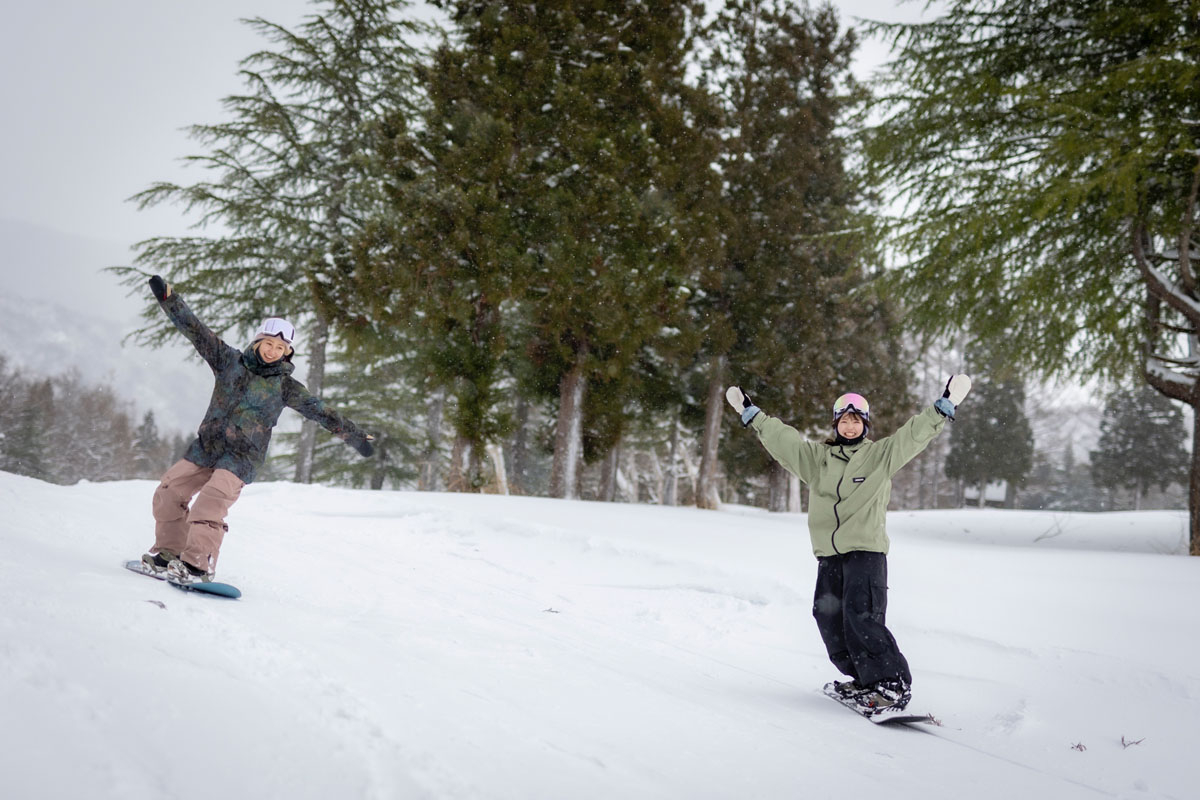 中〜上級者はゲレンデ上部、雪質がよく、晴れれば素晴らしい眺望、そして自然の起伏を楽しめる奥添地エリアのコースを滑りまくろう。降雪時は、例え視界の悪くても気にならないくらいの軽い雪質を味わいながら滑ることができる。