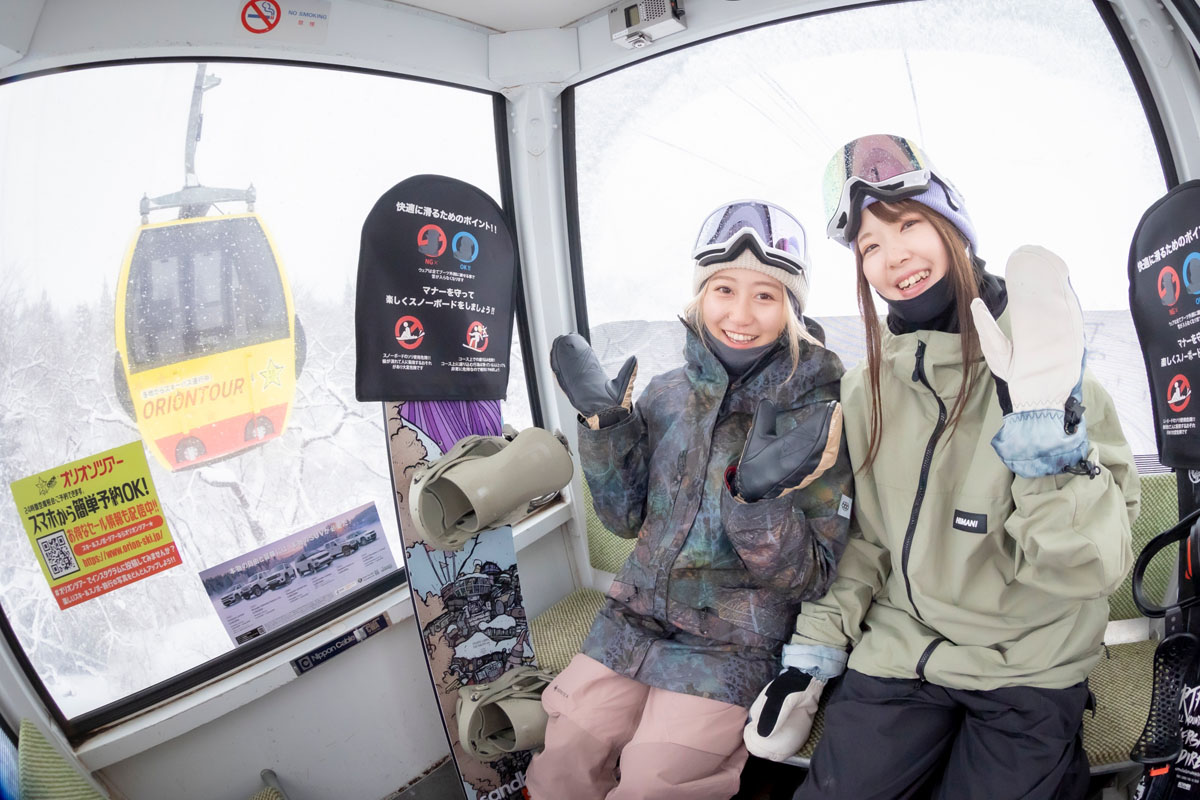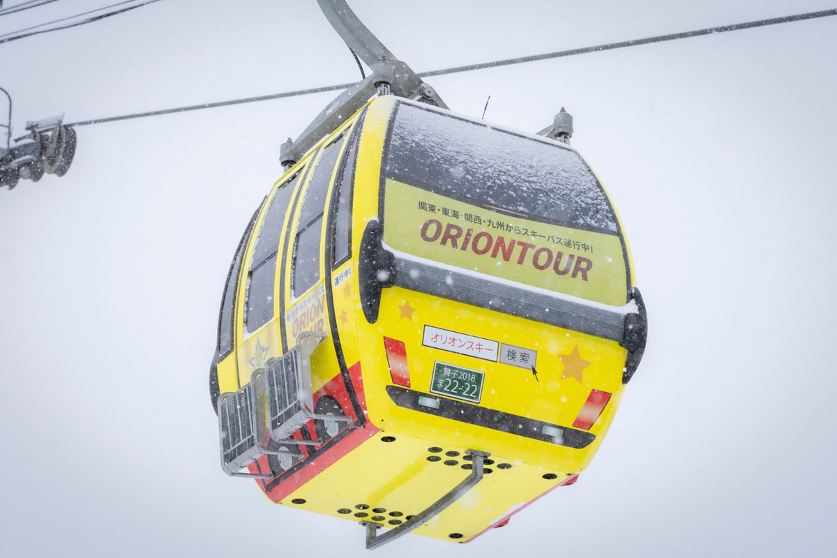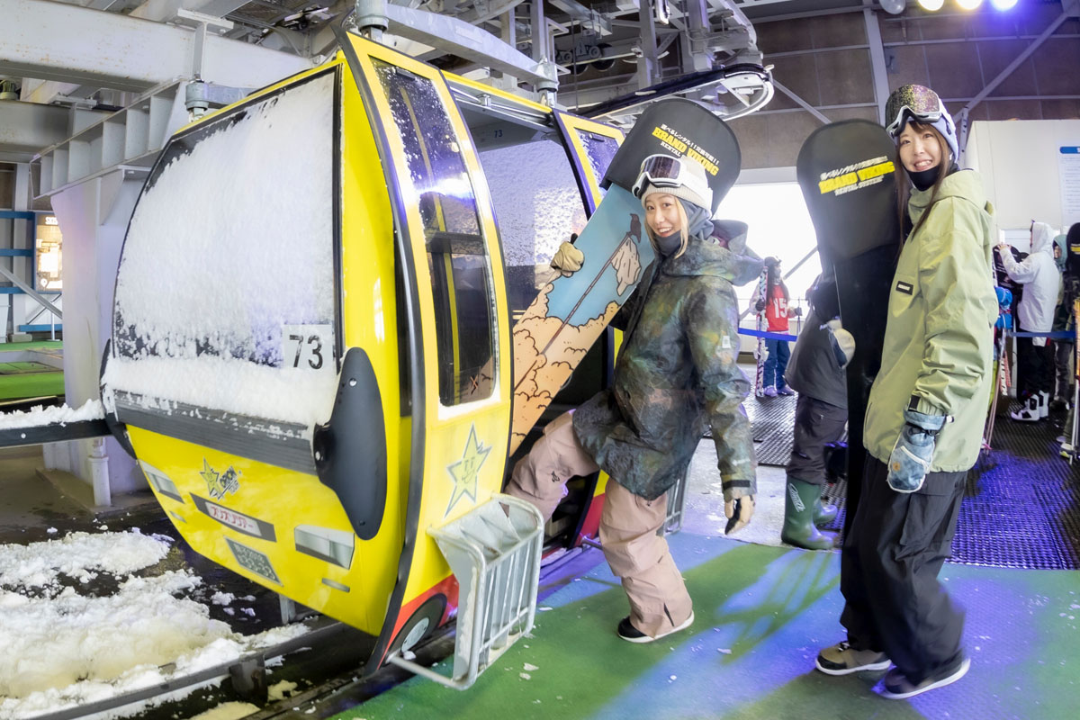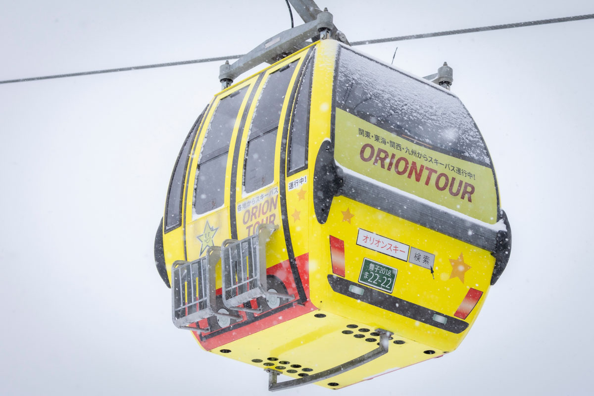 タイミング良く、このコラボ搬器に乗車できたら、めちゃめちゃラッキー。取材した日は、一切のヤラセなく偶然にも1回だけオリオンツアーの搬器に乗車することができた。ソワソワしながら乗車待ちをして、いざ乗る順番で黄色い搬器が現れた時の感動はナミダもの(笑)。たくさん滑って、何回もゴンドラに乗れば確率を上げられるかも!?