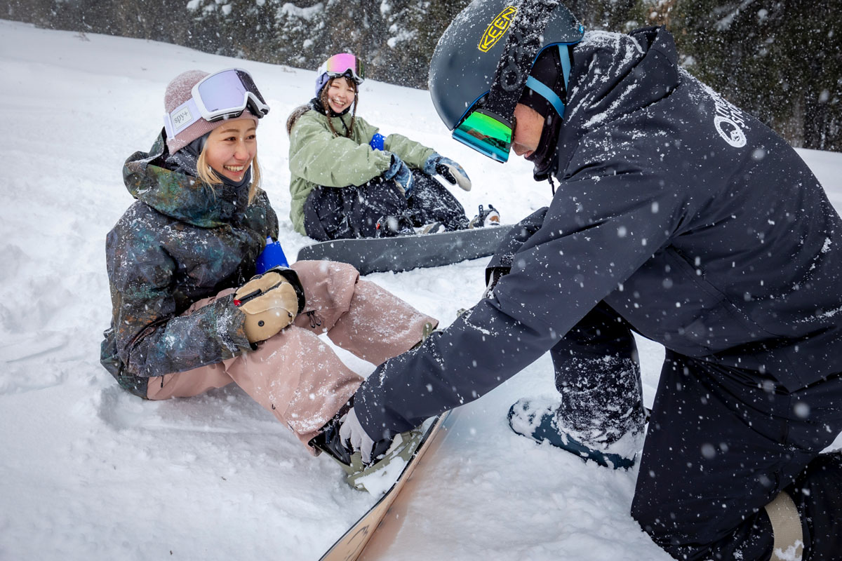 スマイルレッスンでは、コースでのボードの付け方、バインディングの締め具合など基本的なことを教えてくれる。