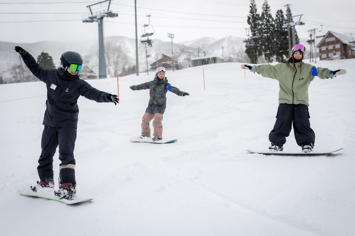 ゲレンデで踊っているシーンではありません(笑)。足首の動きでカカトを上手く使って、スリップしながらボードの動かし方のコツをつかんでいくレッスンなど、人数によって内容は少し変わる場合もある。