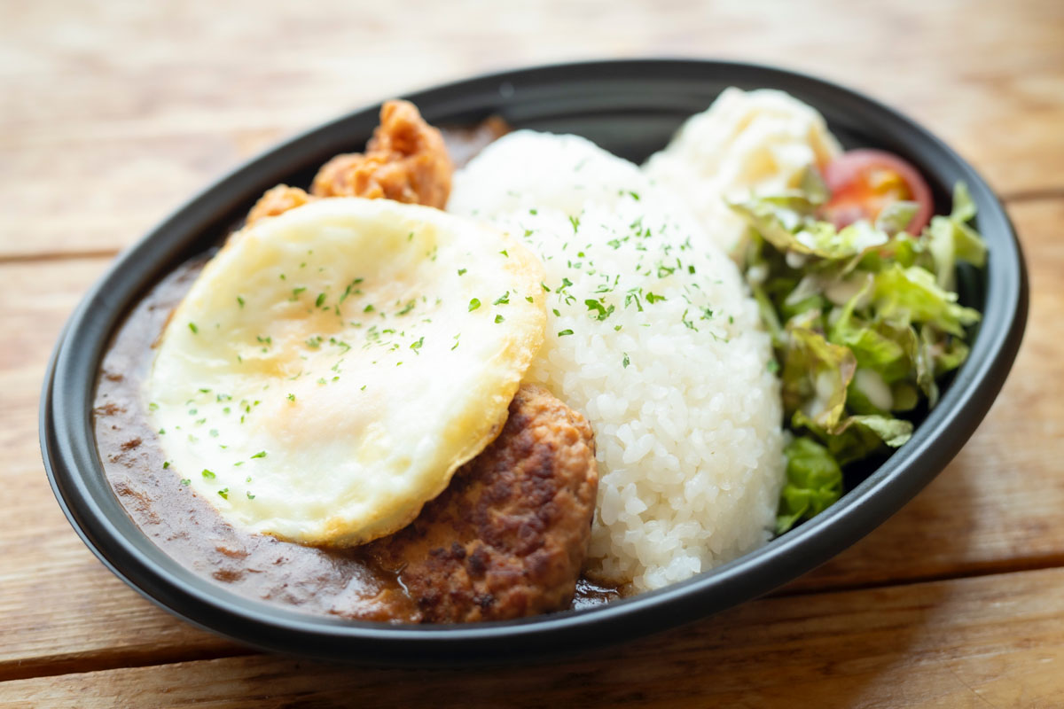 イタダキではカレーやハンバーグなどのプレートに、鳥の唐揚げやフライドポテト、オニオンリングなどのメニューを用意。ランチのおすすめはカレーに鳥の唐揚げやハンバーグをトッピングした贅沢な「イタダキプレート」。
