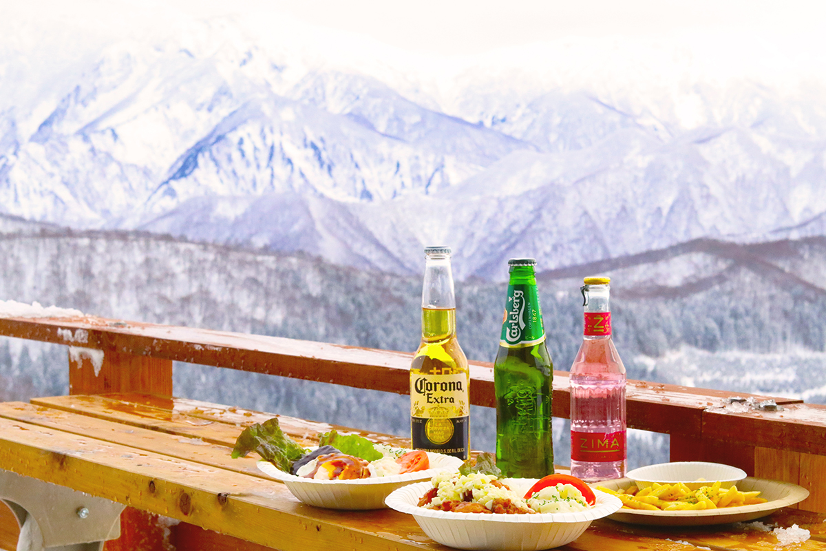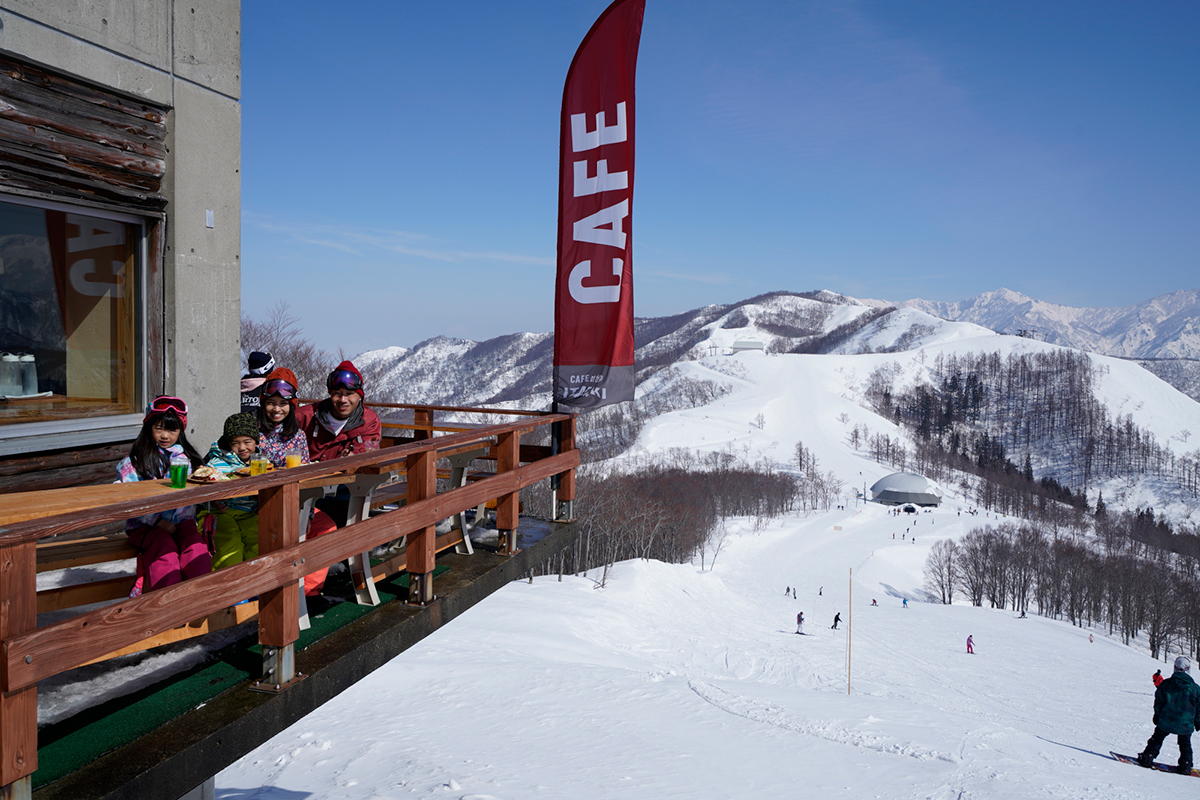ゲレ食でもう一カ所おすすめはゴンドラ山頂駅を出てすぐ目の前にある「café at the top ITADAKI(イタダキ)」。大パノラマの絶景を楽しみながら食事やドリンクを楽しむことができる。