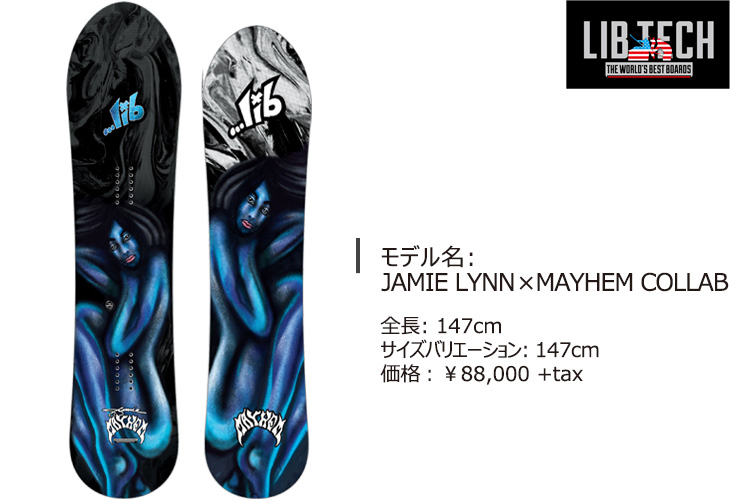 JAMIE ×…LOST/MAYHEM、 豪華なコラボによるパウダーモデル。80年代から交流があるという2人が、スノーボードとサーフィンで得た知識と経験を生かして開発する コラボモデル。147cmながらノーズをワイドにし、浮揚力を確保しながら短いターンも楽しめる。パウダー、ツリーラン、カービングにスラッシュも楽しめ、ジェイミーも大のお気に入り。