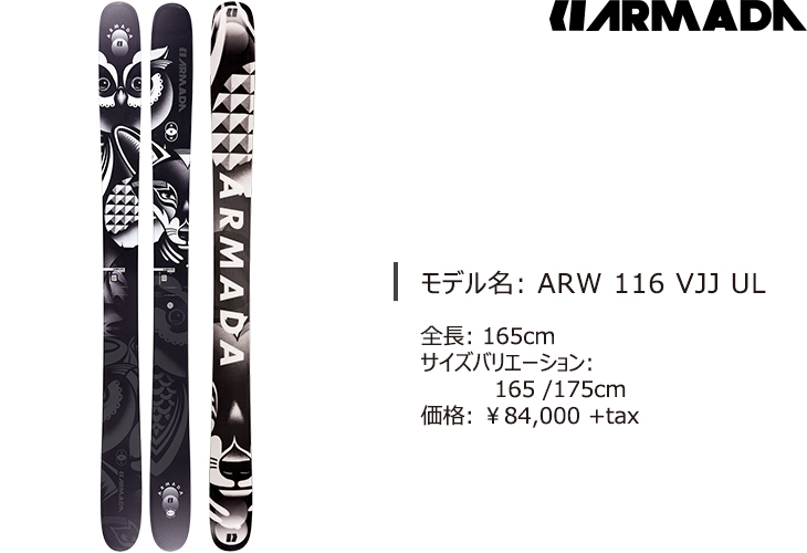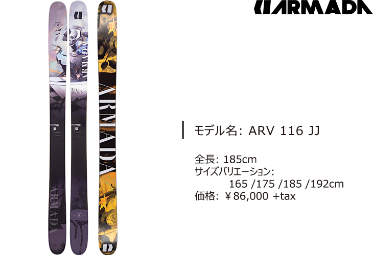 ARV 116 JJをベースにチューンしたレディースモデル。パウダースキーに革命を与えた名機”JJ”の特徴でもあるtop&tailのロッカーとセンターのキャンバーを継承。パウダーでは浮力を生み、ゲレンデではカービングターンも楽しめる。また、top&tailにはエッジレスの3D形状を用いてスイングウエイトの軽減、パウダーでの引っ掛かりのないスムーズな操作性を実現した。基本的な構造&スペックはそのままに超軽量カルバコアを使用し約20%の軽量化(ARV116JJ 165cm比)。女性の体力に合わせてフレックスも柔らかめに設定。パウダー初心者から上級者まで納得の一台。