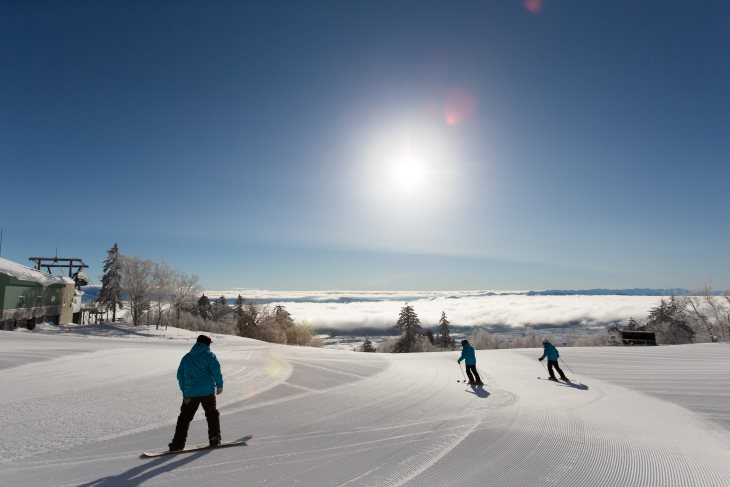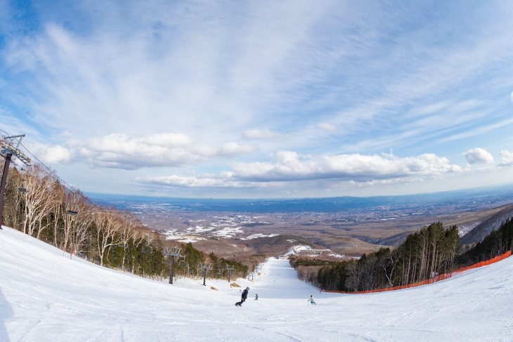 首都圏から車で約2時間、電車なら東北新幹線・那須塩原駅から予約制の無料シャトルバスでアクセスできるマウントジーンズ那須。日帰りで滑りに行ける身近な存在ながら、ゴンドラを利用して全長2,000mのロングコースを味わえるなど、滑りごたえ十分の規模だ。緩急に富んだ全7本のコースレイアウトに加え、人工降雪機による安定したコンディションのなかで快適に滑りを楽しめる。那須高原の広大な自然が眼下に広がるロケーションが素晴らしく、標高1,410mのコンドラ山頂に設置された展望台からの眺めはとくに爽快。青空の下に輝く雪山が広がる眺望は、インスタ映えを狙って多くの人が訪れる人気のフォトスポットとなっている。