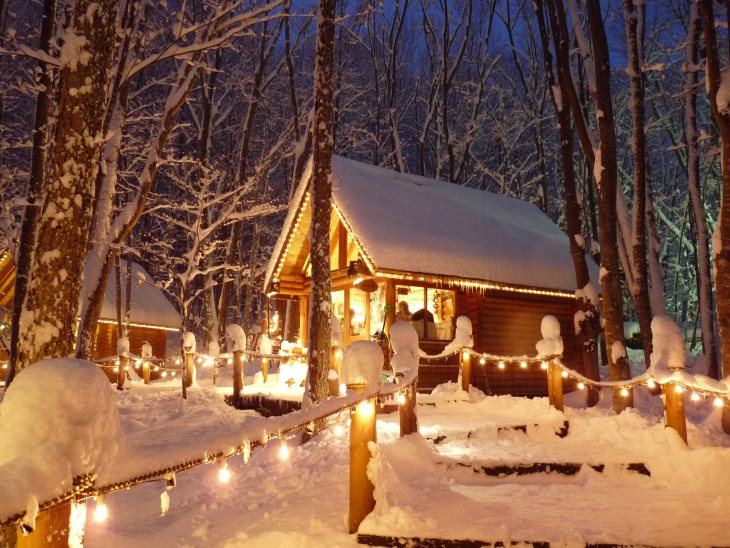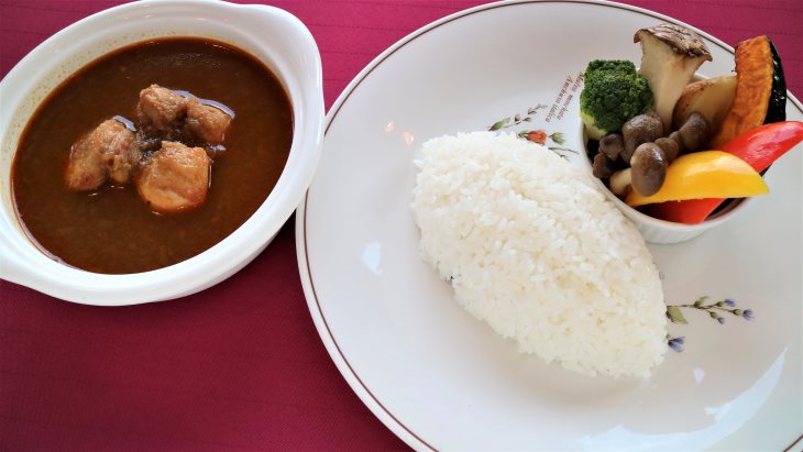 2エリアそれぞれにホテルがあり、館内のレストランでランチも可能。「新富良野プリンスホテル」内のレストラン ラベンダーの人気はスープカレー。鶏肉をメインに、根菜や彩り野菜を添えて楽しむ味も見た目もよい一品だ。ケーキやドリンクも豊富なので、ティータイムの休憩にもぴったり。ホテルは富良野温泉「紫彩の湯」も完備し、なめらかな肌ざわり湯が、心身の疲れを優しく癒してくれる。また、ホテル隣接の「ニングルテラス」は、森にログハウスが連なるショッピングエリア。散策しながらカフェやクラフト教室、各種工房などをめぐることができる。日が暮れるとショッピングエリアにライトが灯り、幻想的な雰囲気に包まれる。