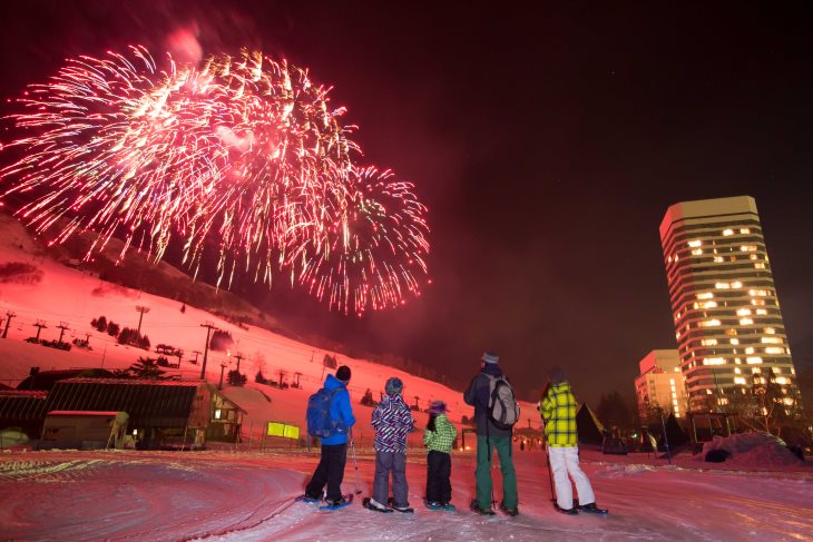 スキー場とホテルを合わせて約30店舗のレストランがあり、ラーメンやピザ、ケバブといった手軽なものから、焼肉、寿司、ブッフェ、居酒屋、中国料理などのゴージャスな食事まで幅広く楽しめる。バーやラウンジもあり、ゲレンデを眺めながらティータイムやオリジナルカクテルを楽しめる「カクテルラウンジシャトレーヌ」がおすすめ。女子同士やカップルでワンランク上の時間を過ごすことができる。また、山麓の苗場プリンスホテルは、宿泊者限定の「苗場の湯」、日帰り利用もできる露天風呂「火打の湯」の2つの温泉施設を完備。マッサージ・指圧ができる「リラックスケア」では、スキー・スノーボードの疲れを癒すことができる。12月下旬~3月下旬は毎週土曜に中心に「ゲレンデ打上花火」を開催。イベントが充実していることも苗場スキー場の魅力だろう。
