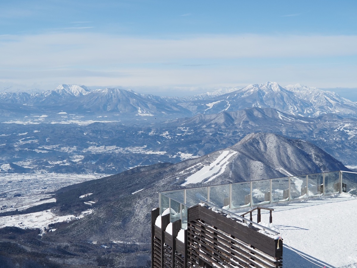 世界最大級166人乗りのロープウェイで行く、標高1,770m地点の山頂テラス「SORA terrace」には滑走具なしでもアクセスでき、誰もが絶景を楽しめるところも人気です。展望テラスからは北アルプスや佐渡ヶ島などを見渡すことができ、条件が揃うと雲海も出現します。