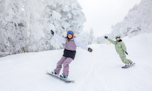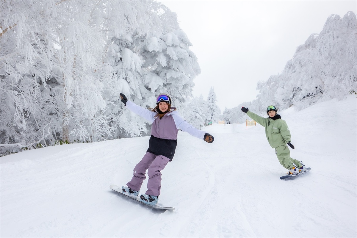「日本一スノボデビューしやすいスキー場」宣言!を実施している竜王スキーパークでは、初心者向けの無料スノーボードレッスンを毎日開催。ブーツの履き方からリフトの乗り降り、滑り方までをインストラクターが丁寧に教えてくれて、3シーズン累計20,000人がここでデビューを果たした。デビューレッスンの予約は不要で、8時から14時までのレッスン時間中にインフォメーションセンター横の動く歩道に乗って「デビューエリア」に行けば、誰でも気軽にレッスンが受けられる。デビューレッスンで滑りの基本を抑えたら、スキー場下部の「山麓エリア」はワイドな緩斜面が広がるので、キレイに整備された気持ちのいいコースでたくさん滑ってめきめき上達しちゃおう。